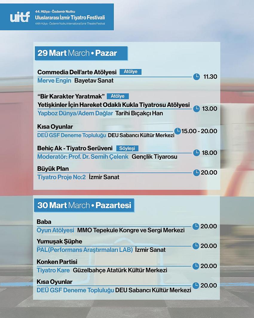 Bayetav Sanat’ta Merve Engin tarafından Commedia Dell’arte Atölyesi 29 Mart’ta saat 11.30’da, Yetişkinler için hareket odaklı kukla tiyatrosu atölyesi Bir Karakter Yaratmak, Tarihi Bıçakçı Han’da saat 13.00’te, Dokuz Eylül Üniversitesi Güzel Sanatlar Fakültesi Deneme Topluluğu’nun Kısa Oyunlar oyunu, saat 15.00’te ve 20.00’de Sabancı Kültür Merkezi’nde yeniden İzmirliler ile buluşacak. Gençlik Tiyatrosu’nda saat 18.00’de ise Prof. Dr. Semih Çelenk moderatörlüğünde Behiç Ak-Tiyatro Serüveni söyleşisi düzenlenecek. Tiyatro Proje No:2’nin Büyük Plan oyunu İzmir Sanat’ta saat 20.00’de sahnelenecek.